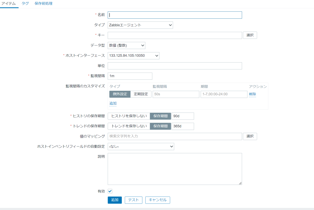 次にzabbix serverで作成したスクリプトの結果を監視するためにアイテムを新規追加します。