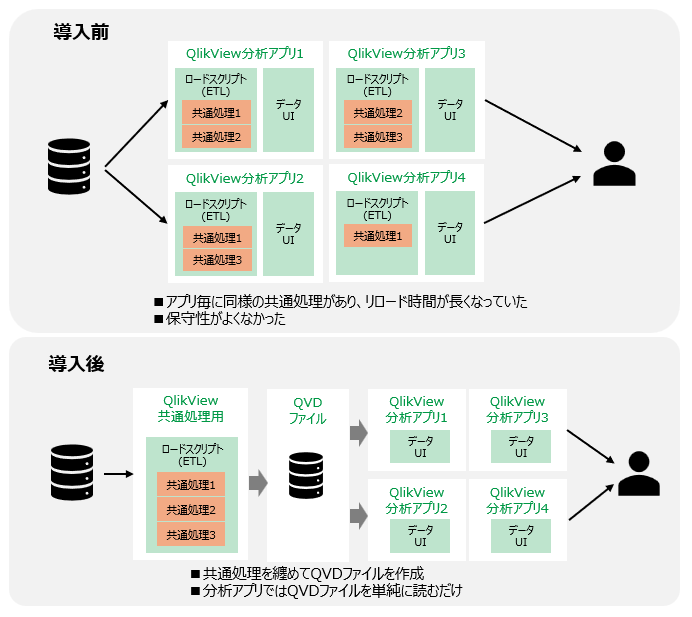 - QlikViewアプリが多数あり、基幹データベースへの直接接続が多重化してDB負荷が高かった。